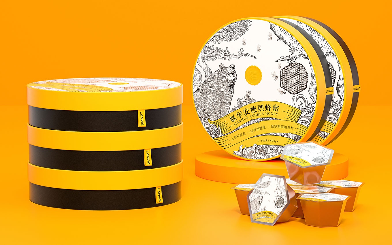 我們獨具創意的蜂蜜包裝設計與眾不同,與傳統的包裝方式有所區別,使產品的使用體驗更加人性化。黑色與黃色的搭配巧妙地突出了蜂蜜產品的行業屬性,給人以強烈的視覺沖擊力,讓人一眼就能辨認出產品所屬的行業。
