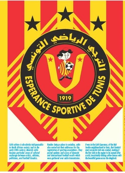 突尼斯希望體育足球隊的logo可以追溯到該俱樂部在突尼斯首都突尼斯市的 Bab Souika 街區(qū)的起源。俱樂部的名字來源于當(dāng)?shù)刂目Х瑞^ Café Esperance,足球愛好者聚集在這里觀看比賽和喝咖啡。足球俱樂部代表了北非更廣泛的傳統(tǒng),除了作為社交中心之外,咖啡館還有出租其場地用于注冊體育協(xié)會的傳統(tǒng)。“由于北非穆斯林影響力巨大,不熟悉穆斯林文化和足球的人可能沒有意識到咖啡館和足球之間的聯(lián)系,”皮納爾繼續(xù)說道“非洲的許多足球logo并非純粹出于營銷角度,而是體現(xiàn)了文化與設(shè)計之間誠實、綜合的互動。”